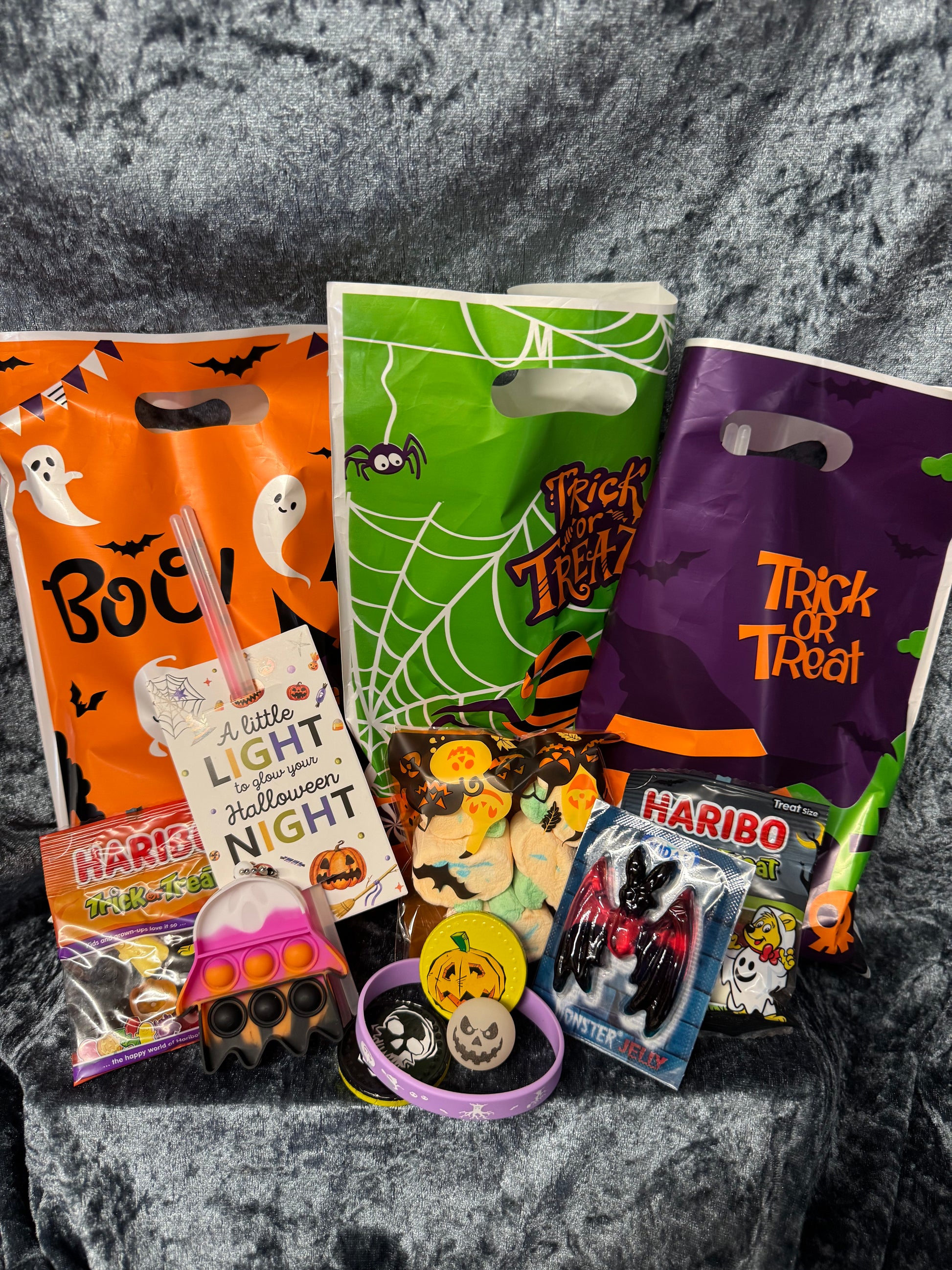 2 x Haribo mini sweets, a monster jelly, 2 spooky coins, and a bag of pumpkin marshmallows