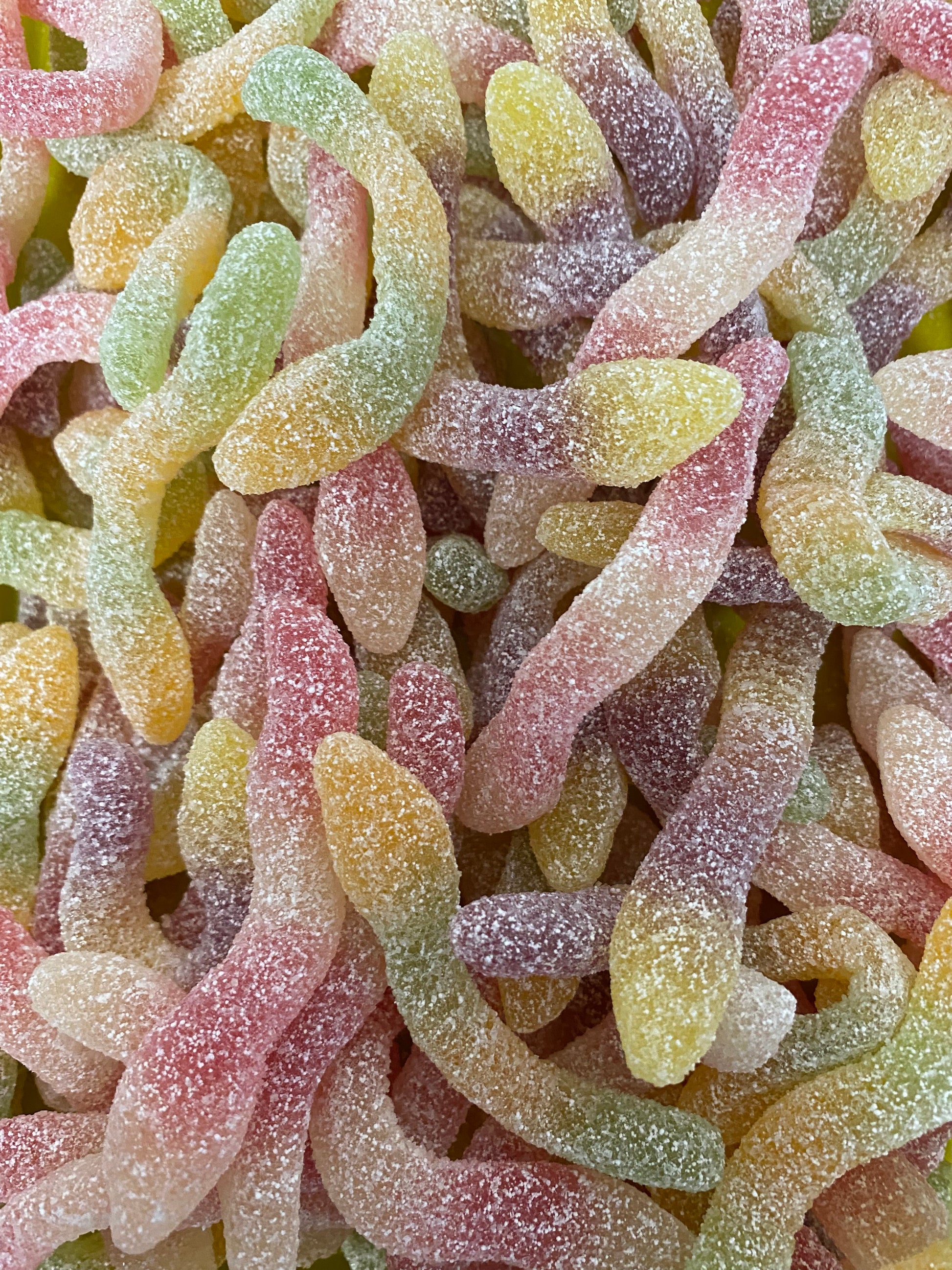 sugar, glucose syrup, water, pork gelatine, acids (malic, sodium malates, lactic, citric), flavourings, fruit, vegetable and plant concentrates (black carrot, spirulina, safflower, grape), colours (curcumin, paprika extract)